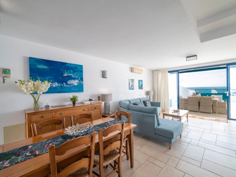 The lounge area has a dining table and comfortable sofas. The Smart TV has Netflix and an IPTV system with channels in many languages.