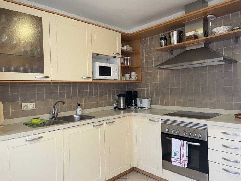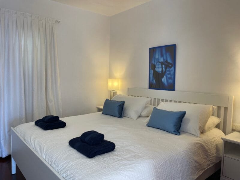 The villa comfortably accommodates up to four guests in three elegantly furnished bedrooms. There are two bedrooms and bathrooms upstairs, one bathroom on the main level, and one further bedroom and bathroom downstairs.
